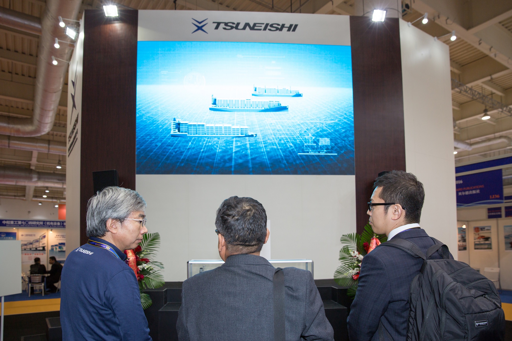 在“SHIPTEC CHINA 2016”的展廳內(nèi),常石舟山介紹了為應(yīng)對多種市場需求而開發(fā)的2800TEU集裝箱運輸船、LR(Large Range I)型成品油輪、以及為擴(kuò)大造船種類正在建設(shè)中的牲畜運輸船。